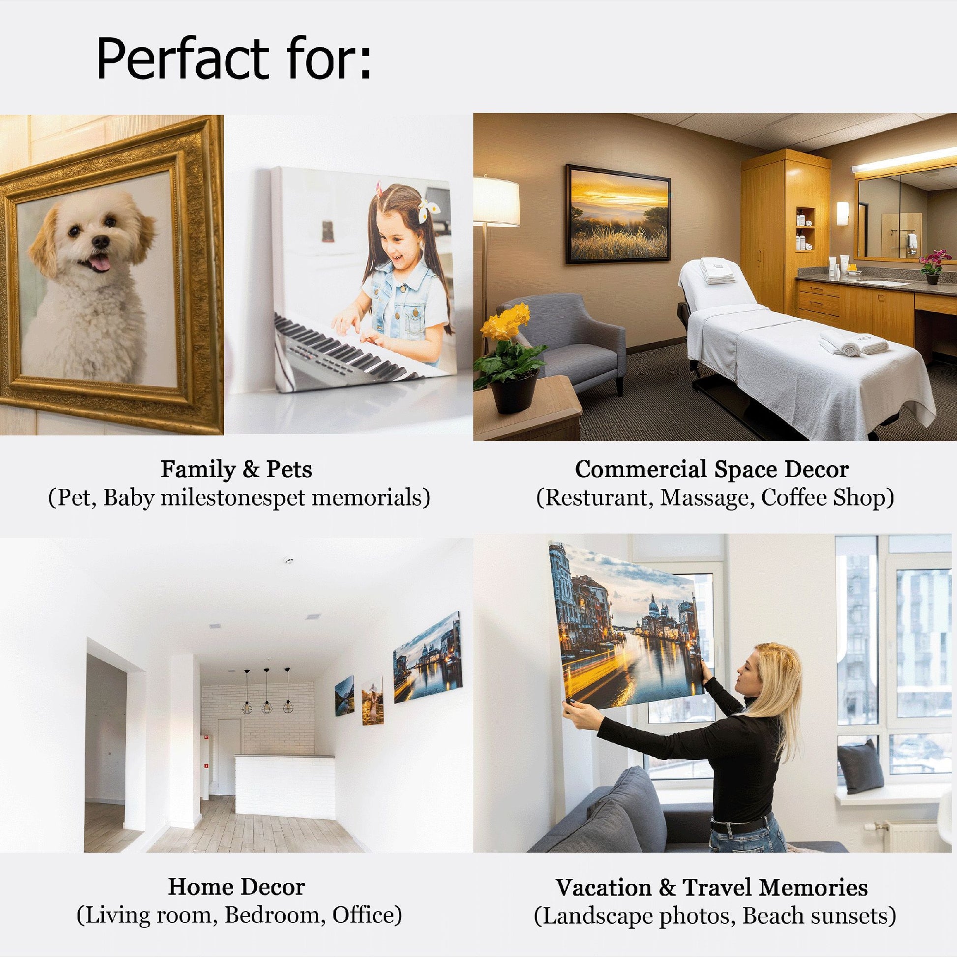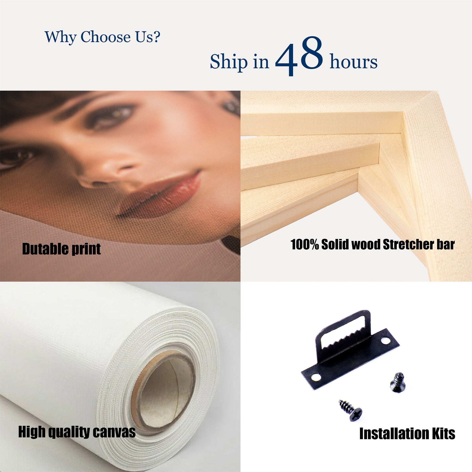 【Product Performance】This product uses high-quality chemical fiber cloth as the base material, with multiple waterproof coatings applied to the surface to achieve a high-gloss effect. The canvas surface has a natural luster and fine, clear texture. It supports high-definition printing with vibrant, full colors and strong image expression. The material is flexible, with excellent tensile strength, resistant to breaking and cracking, and the overall finish is flat and smooth.The canvas is mounted using sturdy and durable pine wood inner frame bars, providing a stable structure that resists deformation. The outer frame uses high-quality PS (Polystyrene) frame bars, which are lightweight, moisture-proof, durable, and fade-resistant. The overall appearance is simple and generous, adapting to a variety of home decor styles.The back of the artwork is equipped with a complete hardware hanging system, including hooks and matching screws, for easy installation and secure hanging, meeting the needs of different wall types and suspension requirements