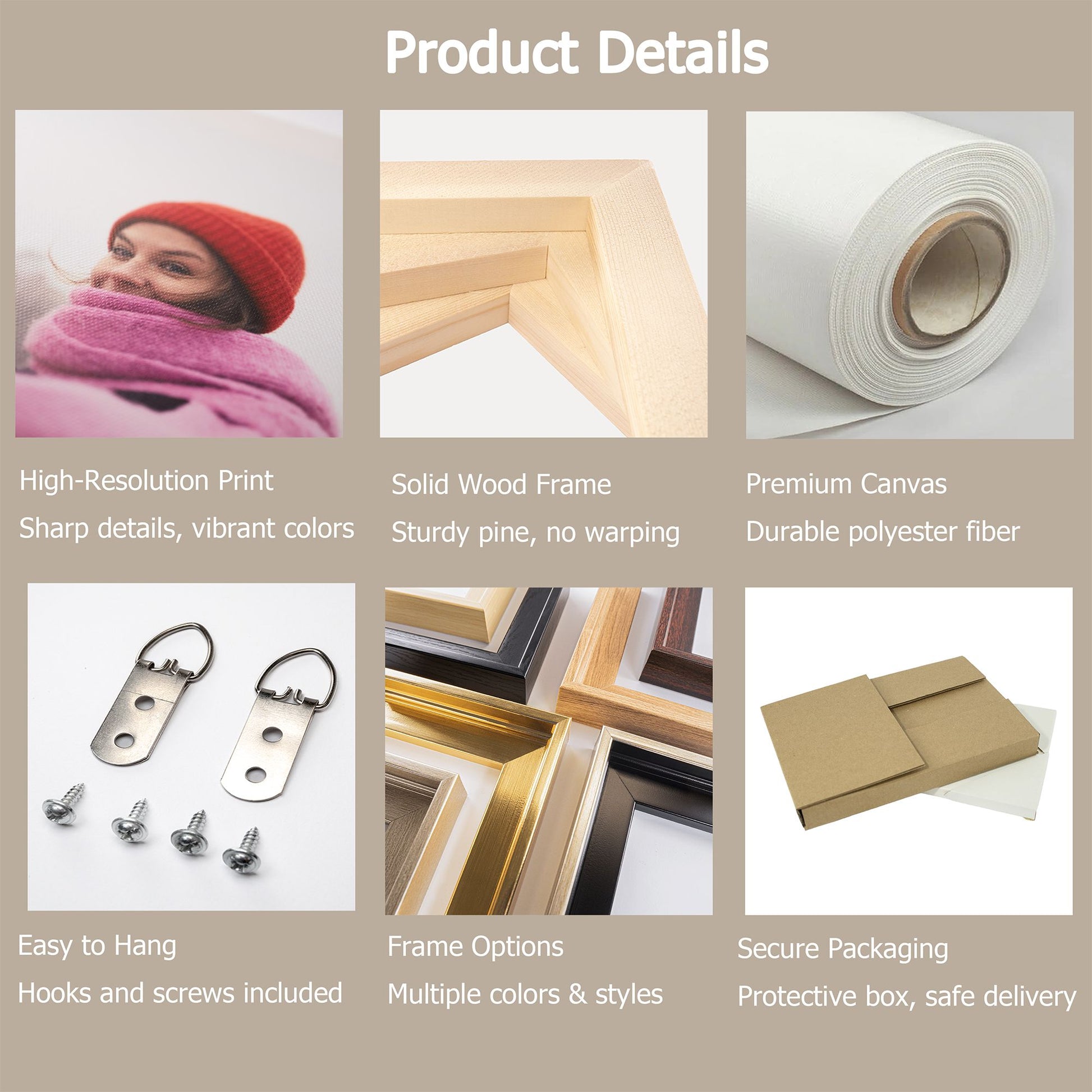【Product Performance】This product uses high-quality chemical fiber cloth as the base material, with multiple waterproof coatings applied to the surface to achieve a high-gloss effect. The canvas surface has a natural luster and fine, clear texture. It supports high-definition printing with vibrant, full colors and strong image expression. The material is flexible, with excellent tensile strength, resistant to breaking and cracking, and the overall finish is flat and smooth.The canvas is mounted using sturdy and durable pine wood inner frame bars, providing a stable structure that resists deformation. The outer frame uses high-quality PS (Polystyrene) frame bars, which are lightweight, moisture-proof, durable, and fade-resistant. The overall appearance is simple and generous, adapting to a variety of home decor styles.The back of the artwork is equipped with a complete hardware hanging system, including hooks and matching screws, for easy installation and secure hanging, meeting the needs of different wall types and suspension requirements